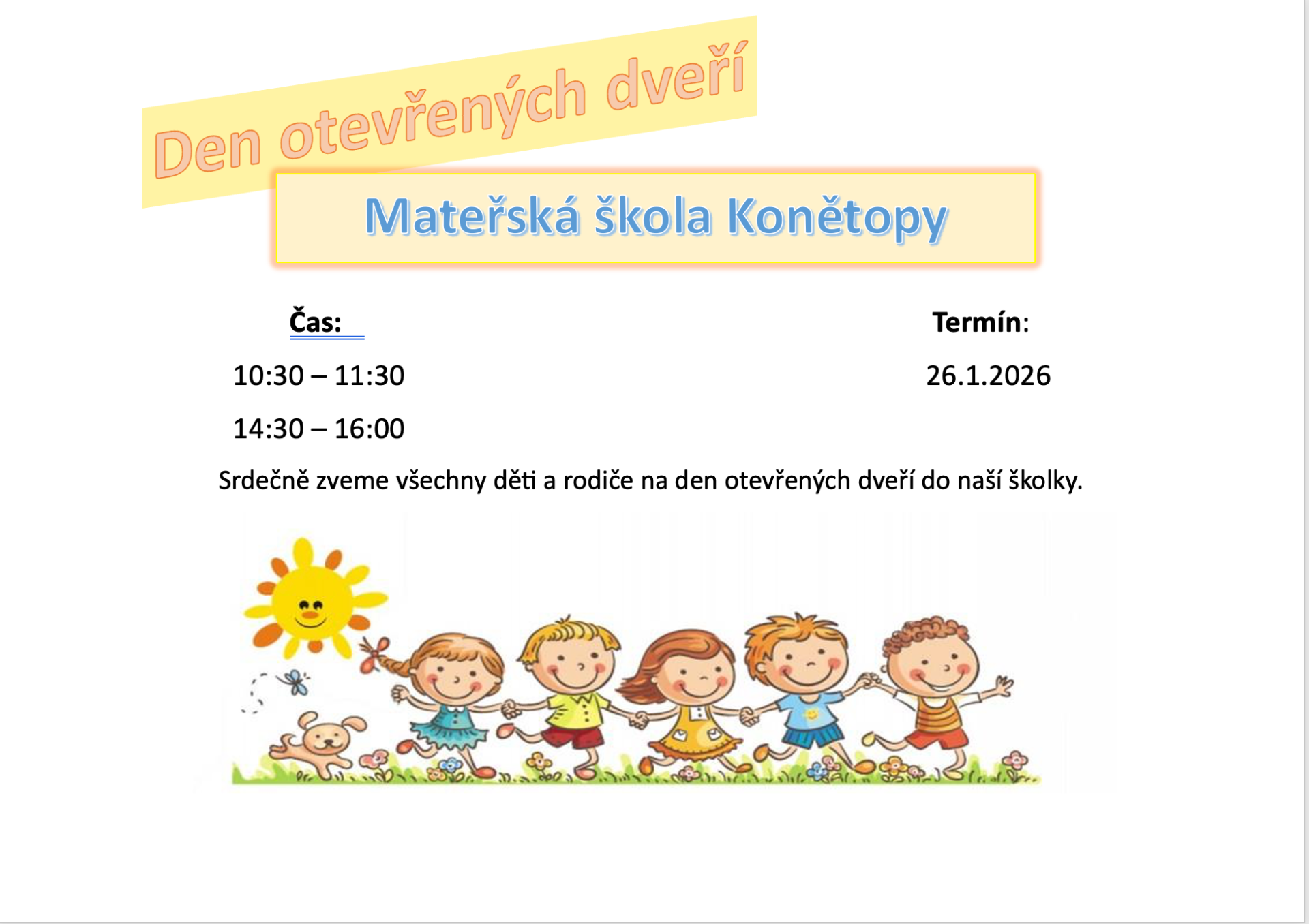 Prázdninový provoz v termínu od 1.7. do 11.7.2025 v MŠ Konětopy, od 14.7. do 18.7. 2025 v MŠ Dřísy